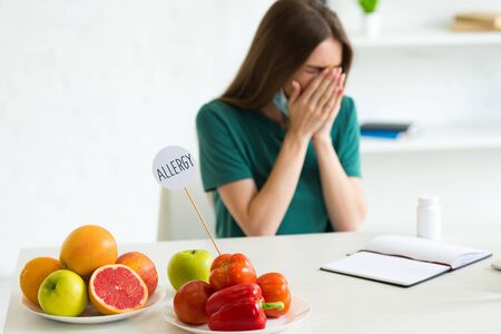 selective focus of woman in medical mask propping face with hands and nameplate with inscription allergy