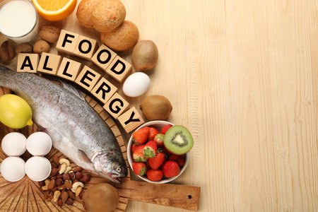 Food allergy. Different fresh products and cubes on wooden table, flat lay with space for text