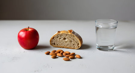 A minimalist composition featuring a red apple, a slice of sourdough bread, a pile of almonds, and a glass of water arranged on a white surface. This still life represents a balanced diet, healthy snacking, simple living, or religious fasting concepts.