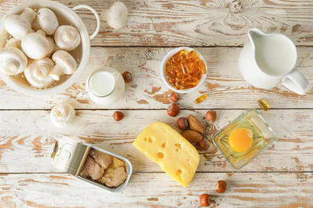 Foods high in vitamin D on light background. Healthy diet concept. Top view, flat lay, copy space