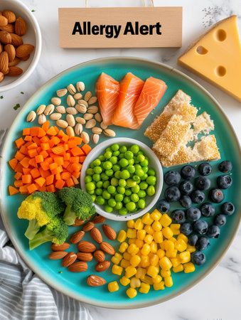 A colorful array of nutrient-dense foods including nuts, fish, and cheese, thoughtfully presented with an 'Allergy Alert' sign to promote awareness. Generative AI.