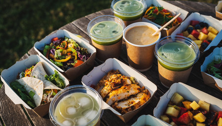 Variety showing assortment of healthy takeaway meals and drinks on a wooden table keywords: healthy food,...