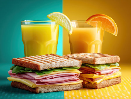 Two glasses filled with orange and yellow juice garnished with orange and lemon slices, next to two grilled sandwiches stacked with ham, cheese, and lettuce arranged on a colorful table