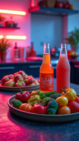 Vibrant kitchen scene with fresh vegetables, fruits, and orange juices illuminated by neon lights.