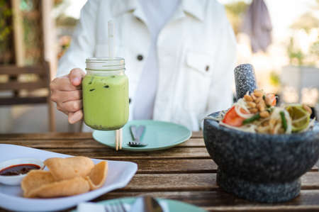 Woman having green tea during a meal in a Thai restaurant closeup