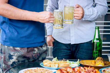 Two young man hand raise a glass of beer to celebrate the holiday festival happy drinking beer outdoors and enjoying at home.