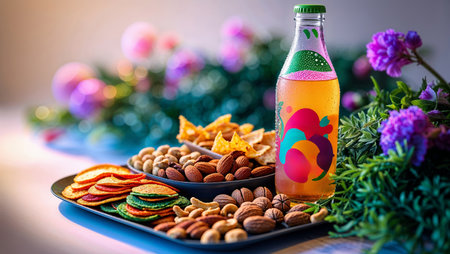 Colorful platter of snacks and a drink displayed on a table with floral decor, creating a festive atmosphere