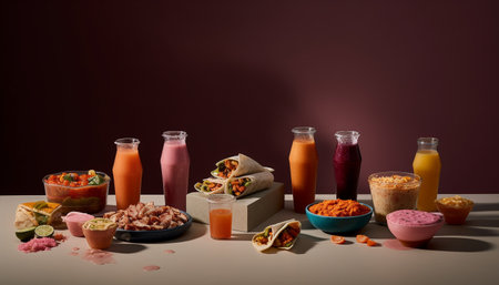 A vibrant composition featuring colorful beverages and packaging arranged on contrasting orange and blue backgrounds, creating a dynamic and eye-catching display perfect for marketing and advertising themes.