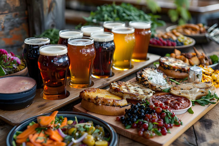 Group of beers served on wooden table in pub. Beer and snacks.