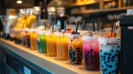 A vibrant shot of a bubble tea shop counter with a selection of bubble tea drinks, toppings, and syrups, showcasing a busy and lively cafe atmosphere.