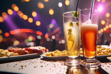 A vibrant display of colorful fruits and refreshing drinks, set against a backdrop of twinkling lights, perfect for summer gatherings.