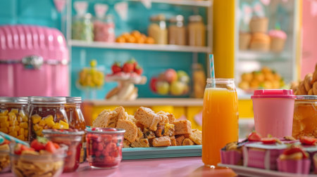 Colorful cereal, marshmallow pops, and soda bottle on a split pink and teal background. Fun, vibrant still life representing sweet treats and child...