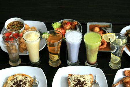 Variety of beverages on a dark table showcasing colorful drinks and coffee cups
