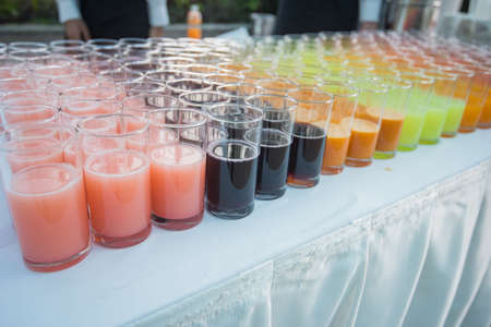 Multicolor juices in plastic disposable cups