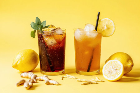 Refreshing summer beverages with lemon and ginger against a vibrant yellow background, perfect for thirst quenching moments and summer enjoyment