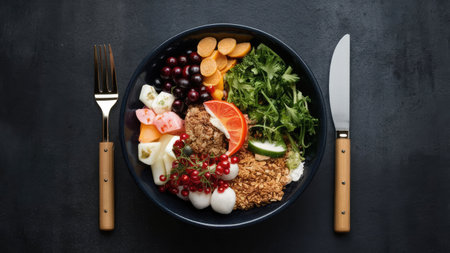 Healthy fitness meal with lean proteins, whole grains, and superfoods, top-down composition on a stylish minimalist paper background. Generative AI