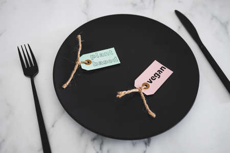 plant-based and vegan labels on top of black dining plate on marble table, concept of healthy nutrition and ethical choices