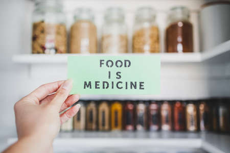 Food is Medicine text in front of tidy organised pantry with jars lined up on shelves, concept of dieting vs healthy nutrition and intuitive eating