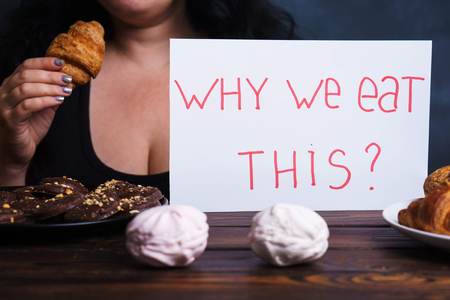 Sad woman eating sweets holding motivation plate