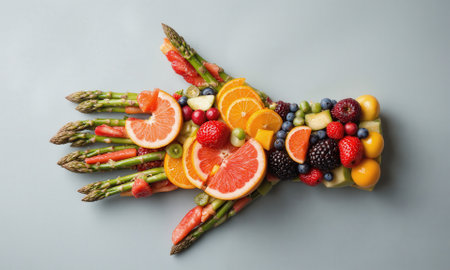 A vibrant display featuring a grilled fish paired with an assortment of fresh vegetables and fruits, showcasing a healthy, organic aesthetic perfect for culinary presentations.