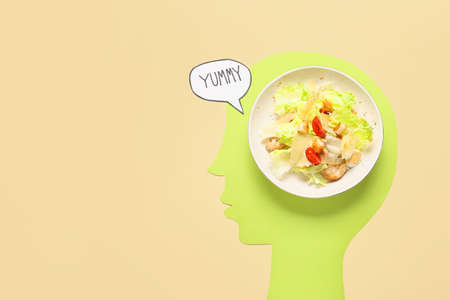 Paper human head, plate of Caesar salad and speech bubble with word YUMMY on color background