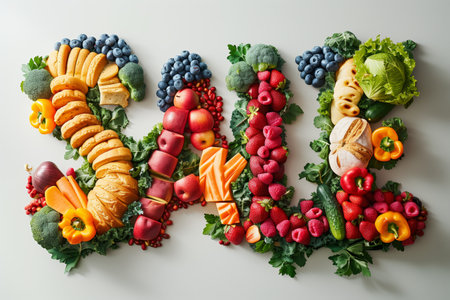 Fresh vegetables, fruits, nuts, and grilled salmon are artfully arranged to spell eat well, promoting healthy eating, balanced diet, and wellness.
