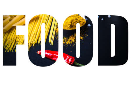 Word FOOD over Different kinds of pasta, red chili pepper, rosemary, sea salt and spices on a black background.