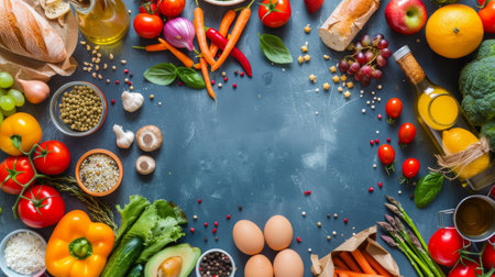 Healthy food selection on blue background. Top view, flat lay. generative ai