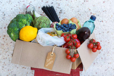 Zero waste no plastic home delivery service. Box of food in recyclable and reusable, eco friendly package near the customer door. Online internet order, shopping. Sustainable lifestyle concept