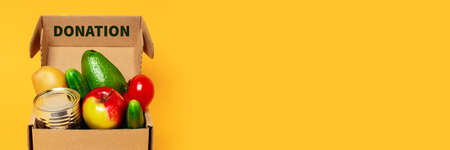 various food in a cardboard box and a donation sign on a yellow background, the concept of donation.