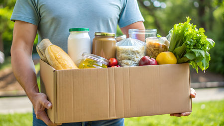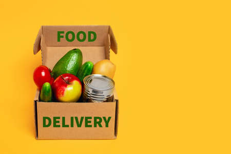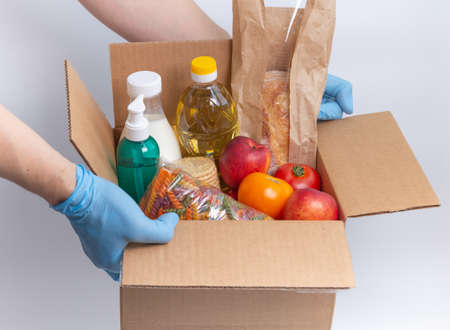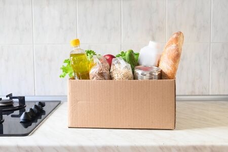 Delivery food to home. Safe delivery in coronavirus time. Donation food. Box with stocks for rainy day.