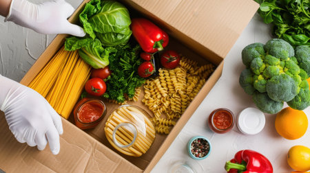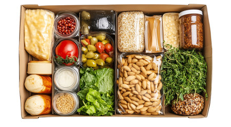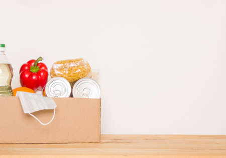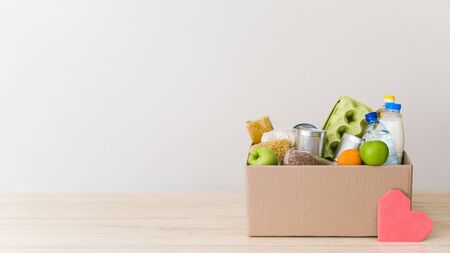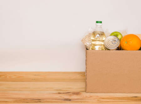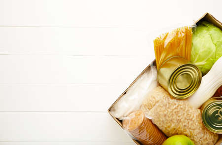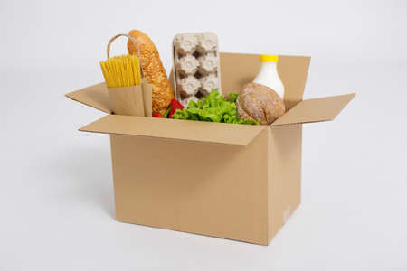 Donation box with food on a white background. Delivery of essential foodstuffs. Place for text.