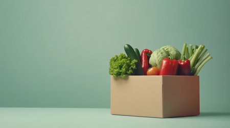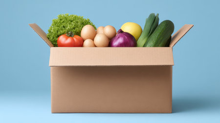 A cardboard box filled with fresh organic vegetables and eggs on a light blue background, showcasing a vibrant and healthy food delivery option.