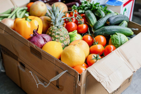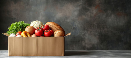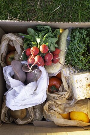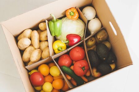 cardboard box with food. vegetables and fruits in a cardboard box. food delivery and food bank concept.