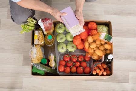 Overhead View Of A Man Checking The Groceries In The Cardboard Box