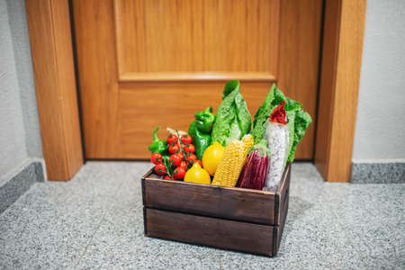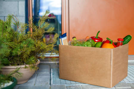 Food shopping box stand at the door of the house or apartment. Vegetables and fruits delivery during quarantine and self-isolation.
