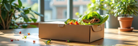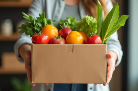 Fresh veggie box on sunlit table with leafy greens and cherry tomatoes. That the image is generated using AI.