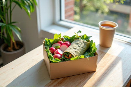 Healthy vegan wrap with fresh vegetables and herbal tea by sunlit window. That the image is generated using AI.