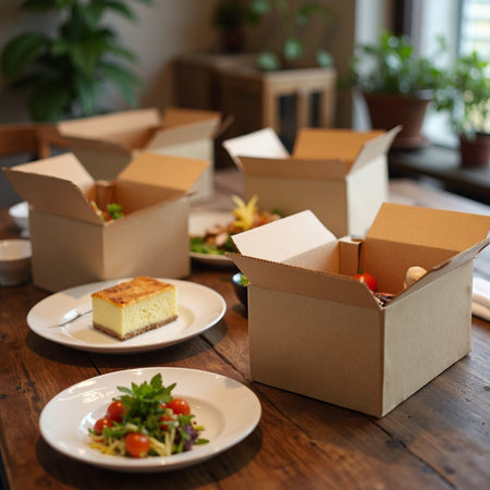 Several cardboard boxes are placed with various food dishes on a rustic wooden table, creating a warm and inviting atmosphere that can be used for food delivery service marketing.