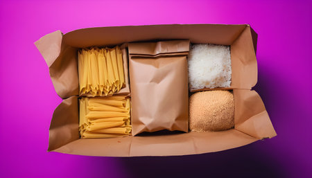Paper bag with Food supplies crisis food stock for quarantine. Pasta, buckwheat, sugar, rice. Donation. Top view