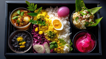 A beautifully arranged vegetarian meal featuring a variety of colorful ingredients served in a traditional wooden tray, offering a feast for the eyes.