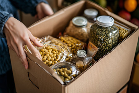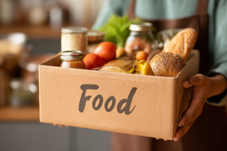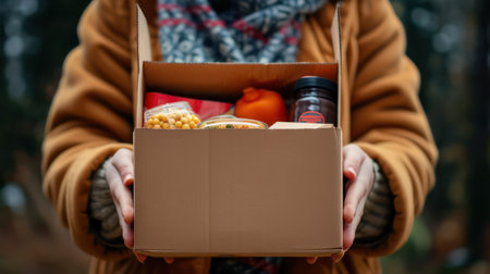 flat lay hand holding box food donation