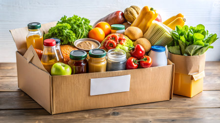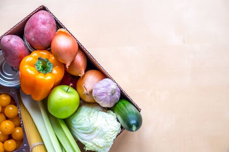 A box of fresh produce, vegetables, butter, stew, toilet paper for donation. View from above, place for inscription.
