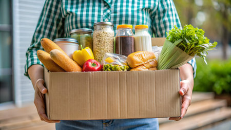 Woman volunteer hands holding food donation box with food grocery products. Donations for charity, food bank.