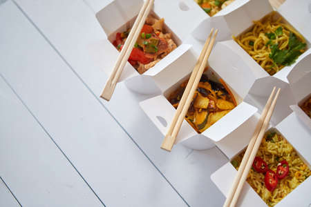 Various oriental dishes packed in paper box. Food is delivered on the table. Asian take away meal concept.