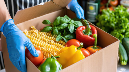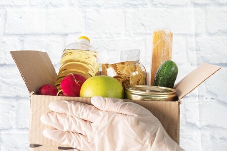 Person in latex gloves has holding a box with ordered goods. Safe food delivery service under quarantine. Online shopping food service or donation concept.White background.High quality close-up photo