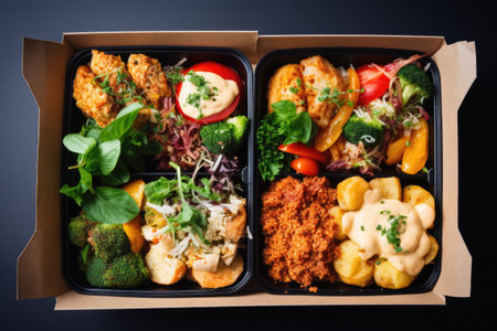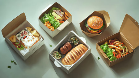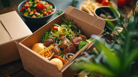 Various types of food packed in boxes, creating a delightful array of flavors and cuisines., Restaurant healthy food delivery in take away boxes, AI Generated, AI Generated