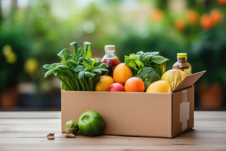 cardboard box with food. Vegetables and fruits in a cardboard box. food delivery and foot bench concept.