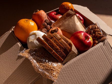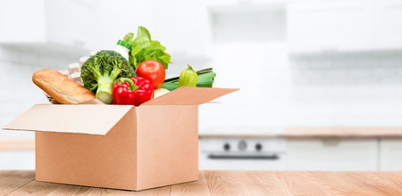 Close-up cardboard box with fresh packed food products on wooden kitchen table. Safe delivery concept. Social food donation. Safe contactless home food delivery during quarantine. Selective focus.