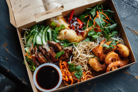 Cardboard box full of tasty asian food with fried shrimps, roasted duck breast, noodles and vegetables, with soy sauce on the side